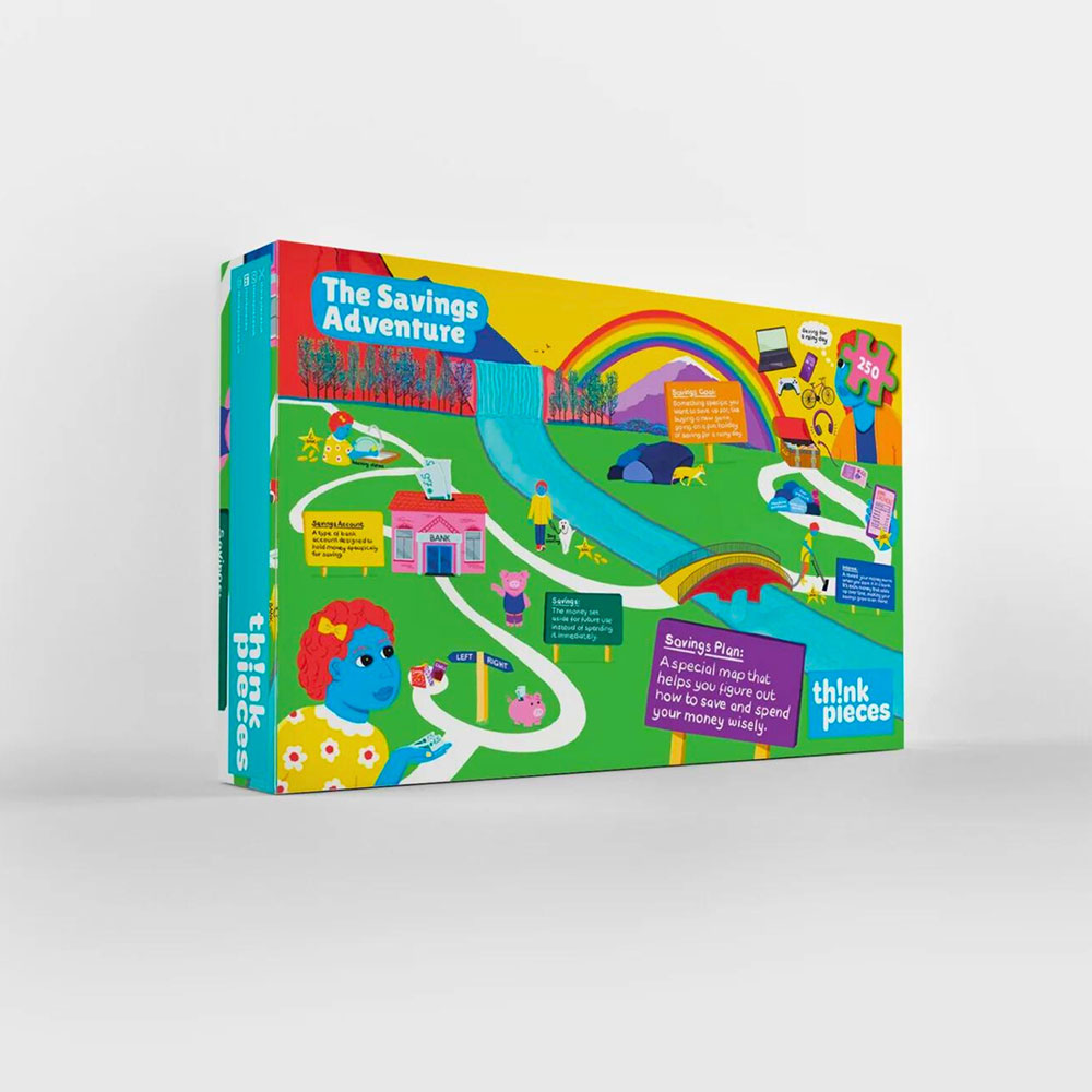 Embark on 'The Savings Adventure' puzzle by Think Pieces! Dive into a fun and educational journey that teaches children the importance of saving money. This engaging jigsaw puzzle simplifies the concept of savings and turns it into an exciting adventure for young minds. Perfect for families and educators, 'The Savings Adventure' puzzle makes financial literacy fun and accessible. An activity book is available with this puzzle, giving children challenges and activities related to this topic to extend learning at home. Suitable for ages 7+